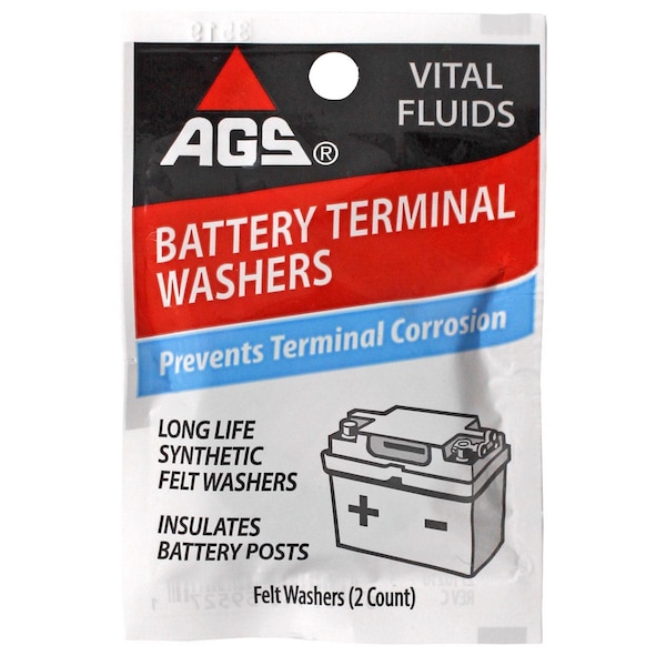 Battery washers prevent corrosion and extend battery life Battery Terminal Washers are designed to offer superior protection to battery post connections and ensure maximum life of your battery. These highly insulating synthetic felt washers help seal out corrosive vapor moisture and dirt and are easily fit around all battery post sizes. Features - Prevents terminal corrosion - Long life synthetic felt washers - Insulates battery posts - Self adhesive backing for easy installation Benefits - Keeps your car's battery at full power for longer periods of time by preventing corrosion on the terminals and increasing the electrical connection stability - Properly insulated terminals reduce sparks on connections to eliminate potential hazards that could damage sensitive car components - Low profile design keeps terminals protected while providing a clean aesthetic under the hood.