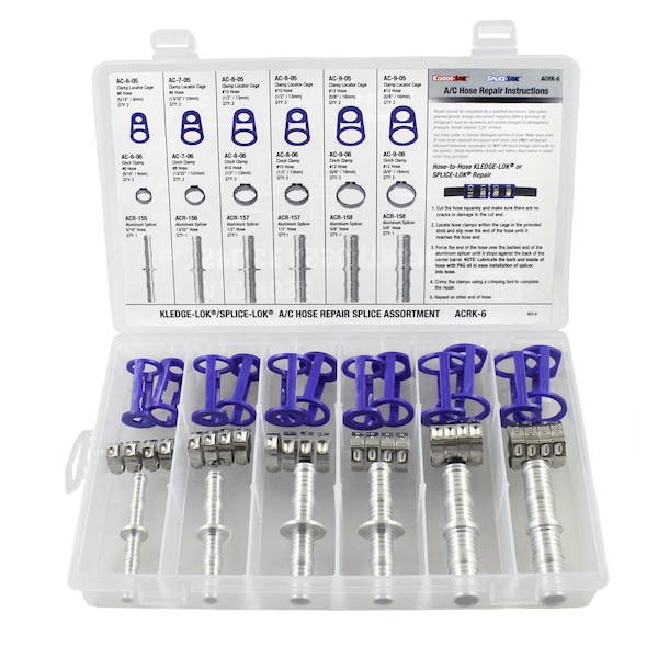 A/C Hose Splice Connection Kit. Splice Together All Sizes Of Reduced-Barrier A/C Hose. Contents Include Aluminum Splice, Cage, And Clamps. Creates Leak-Free Hose To Hose Connections For Both Kledge-Lok And Splice-Lok Repair Systems.