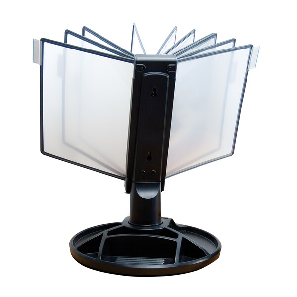 The Aidata Reference Organizer System provides efficient organization and presentation of your everyday reference materials. This organizer includes 10 anti-glare polypropylene display panels allowing 20 pages (back-to-back) of important and regularly referenced information to be close, organized and easily accessible. The 25° tilt and 360° rotation of the display stem allow for easy access and viewing while the large circular base complete with stationary trays declutters the desktop. Additional features include snap-on index tabs for enhanced filing. Find it fast with the Flip and Find Reference Organizer System.
