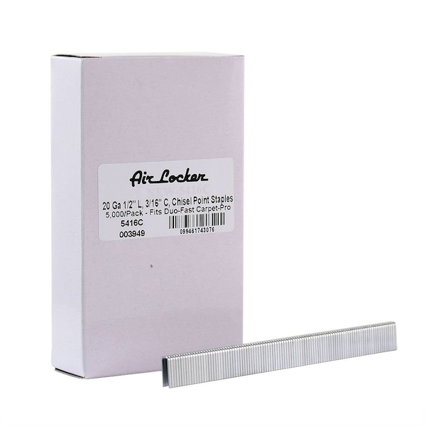 The AIR LOCKER - 5416C Carpet Staples are designed with a leg length of 1/2 inch and a crown width of 3/16 inch. These measurements, combined with the fine wire type and chisel point, make these staples suitable for precise carpet installation tasks. The gauge is 20, which indicates that they have been built to provide adequate strength while maintaining flexibility.