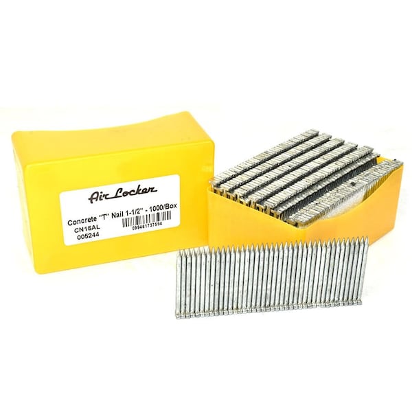 Air Locker 14 gauge x 1-1/2" length T nails are designed for wood to concrete or light gauge steel applications. This is an ideal way to have any size you need to match the job. Comes in a plastic box contains 1000 "T" Nails. T-Nails to accommodate many applications including nailing plywood to concrete, Light gauge steel drywall track to concrete, wire lath to masonry, steel banding to wood, wood to steel, decking, fencing, sub flooring general construction and much more. Nails are Galvanized using electroplated process.