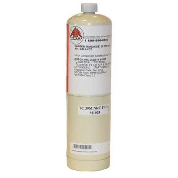 Calibration Gas, Container Type Cylinder, Cylinder Capacity 17 L, Cylinder Diameter 3 in, Cylinder Height 11 in, For Use With Mfr. No. CO-91, Gas Type Carbon Monoxide, Product Type Calibration Gas, Accuracy +/-2 Percent, Background Gas Carbon Monoxide, Calibration Certificate NIST, Cylinder Material Aluminum, Outlet Connection Type 593, Standards GHS Rev 03, OSHA 29 CFR 1910.1200(g), Reusability Disposable, Operating Pressure - Maximum 240 psi