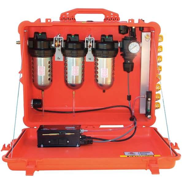 Portable Filtration Panel, Number of Users 8, Includes (2) Automatic Drains with Discharge Tubes, CO Monitor, External Warning Lights and Alarm, Incoming Air Plug, Remote Alarm Receptacle, Maximum Pressure 125 psi, System Type SAR System, Air Flow 123 cfm