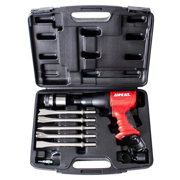 3,000 Blows per minute for fast cutting action; High performance and low weight; Multi-patented muffler/exhaust system gives this tool and extremely low noise level of (88 dBA) and vibration level of 4.2 m/sec2; Includes heavy duty ball-lock quick change chisel retainer adding safety and reliability; Includes: Blow Mold Kit, 5 Pc. Chisel Set and Quick Change Retainer