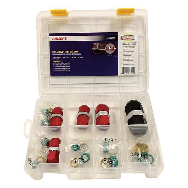 Line Splice Straight SAE Pack, Tool Type Line Splice Straight SAE Fittings, Application Metal Line Repair Solution, Durable Leak Repair with No Line Removal, For Use With A/C Lines, Heater Lines, Power Steering Lines, Transmission Lines, Material Aluminum, Rubber, Outside Diameter 5/16 in, 3/8 in, 1/2 in, 5/8 in, 3/4 in, Size 2 in H x 7 in W x 9 in D, Includes Anti-Vibration Tension Rings, Coupler Bodies, Nuts, Sealing Sleeves, Number of Pieces 36