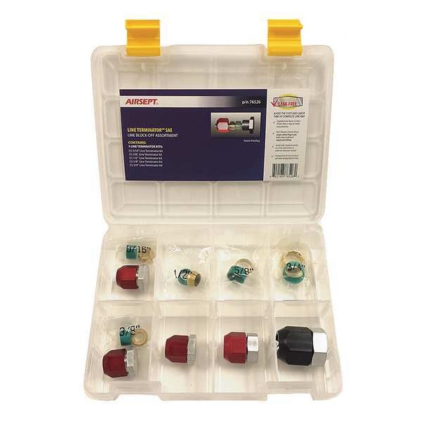 Line Splice Straight SAE Pack, Tool Type Line Terminator Blockoff, Application Automotive, For Use With Block Damaged or Unused A/C Lines, Material Aluminum, Rubber, Outside Diameter 5/16 in, 3/8 in, 1/2 in, 5/8 in, 3/4 in, Size 2 in H x 7 in W x 9 in D, Includes Anti-Vibration Tension Rings, Blockoff Bodies, Nuts, Sealing Sleeves, Number of Pieces 21
