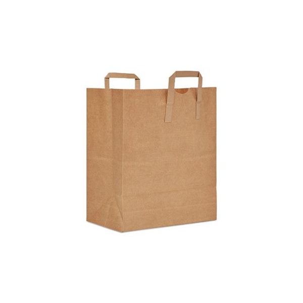 Kraft paper bag with handles for easy carrying. Durable construction for reliable containment. Flat bottom keeps items secure and allows bag to stand on its own. Application: Shopping; Materials: Kraft Paper; Width: 17.75in; Depth: 12.12in.