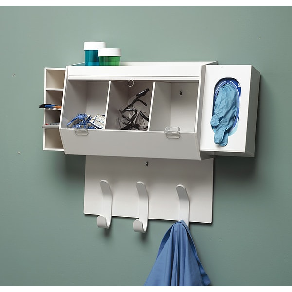 Item Personal Protection Organizer, Number of Compartments 9, Autoclavable No, Material PVC, White, Height 20 in, Width 18 1/8 in, Includes (3) Covered Compartments, (3) Hooks, (4) Safety Glass Cubbies, Glove Box Dispenser, Shelf