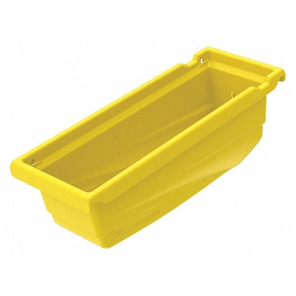 Hanging Bin, Outside Length 11 1/2 in, Outside Width 4 1/8 in, Outside Height 4 1/2 in, Inside Length 9 5/8 in, Inside Width 2 1/2 in, Inside Height 4 5/16 in, Volume Capacity 0.06 cu ft, Load Capacity 10 lb, Material Industrial Grade Polymer, Color Yellow, Use Divider No. Mfr. No. 46110, Use with Grainger Divider No. 36MY16, Use Lid Number Mfr. No. 36111CRY, Use with Grainger Lid No. 36MY18, No. of Divider Slots Long 1, No. of Divider Slots Short 0, ESD Conductive No