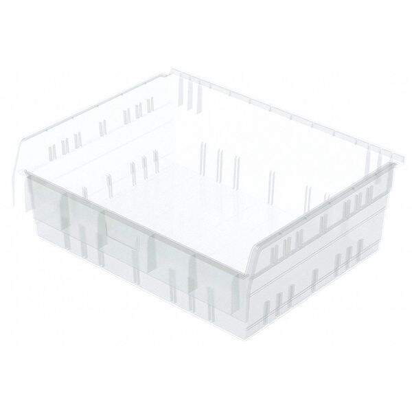 Shelf Bin, Outside Length 17 5/8 in, Outside Width 22 1/2 in, Outside Height 8 in, Inside Length 15 1/4 in, Inside Width 20 13/16 in, Inside Height 7 15/16 in, Volume Capacity 1.47 cu ft, Load Capacity 35 lb, Material Industrial Grade Polymer, Color Clear, Use Divider No. Mfr. No. 40820, No. of Divider Slots Long 7, No. of Divider Slots Short 7, Includes Label Area on Front of Bin, ESD Conductive No