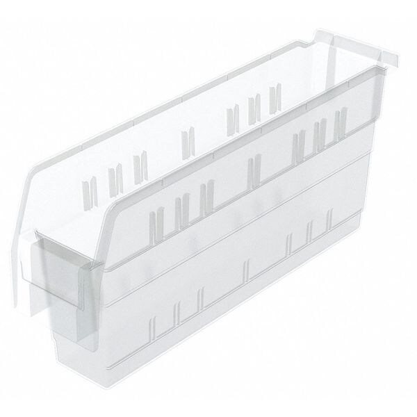 Shelf Bin, Outside Length 17 5/8 in, Outside Width 4 1/8 in, Outside Height 8 in, Inside Length 15 1/4 in, Inside Width 2 1/2 in, Inside Height 7 15/16 in, Volume Capacity 0.22 cu ft, Load Capacity 25 lb, Material Industrial Grade Polymer, Color Clear, Use Divider No. Mfr. No. 40840, No. of Divider Slots Long 7, No. of Divider Slots Short 7, Includes Label Area on Front of Bin, ESD Conductive No
