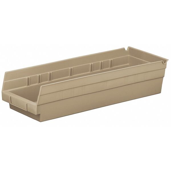 Shelf Bin, Outside Length 17 7/8 in, Outside Width 6 5/8 in, Outside Height 4 in, Inside Length 16 1/2 in, Inside Width 5 1/2 in, Inside Height 4 in, Volume Capacity 0.20 cu ft, Load Capacity 20 lb, Material Industrial Grade Polymer, Color Sandstone, Use Divider No. Mfr. No. 40130, Use with Grainger Divider No. 3A564, No. of Divider Slots Long 0, No. of Divider Slots Short 7, Includes Molded-In Label Area, ESD Conductive No