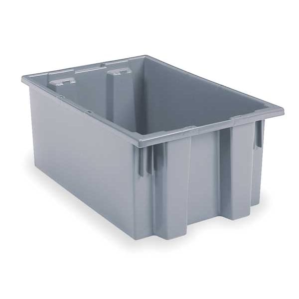 Stacking and Nesting Tote, Container Wall Type Solid, Fork Pockets Fork Pockets Not Included, Includes Lid Lid Not Included, Material Plastic, Maximum Operating Temperature 140 Degrees F, Minimum Operating Temperature -5 Degrees F, Body Color Gray, Nestable Nesting Capable, Overall Height 10 in, Overall Length 19 1/2 in, Overall Width 15 1/2 in, Resistant To Alkali, Corrosion, Rust, Water, Weak Acid, Stackable Stacking Capable, Stacking Capacity 325 lb, Volume Capacity 9 gal