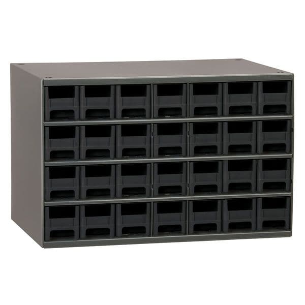Drawer Bin Cabinet, Cabinet Color Gray, Cabinet Material Steel, Drawer Color Black, Drawer HxWxD (28) 2 3/16 in x 10 9/16 in x 2 1/16 in, Drawer Material Polystyrene, ESD Conductive No, Number of Dividers 56, Number of Drawers 28, Overall Depth 11 in, Overall Height 11 in, Overall Width 17 in, Stackable Yes, Cabinet Finish Powder Coated, Cabinet Storage Components Drawers, Drawer Depth 10 9/16 in, Drawer Height 2 1/16 in, Drawer Width 2 3/16 in, Duty Rating Heavy Duty, Frame Assembled Assembled