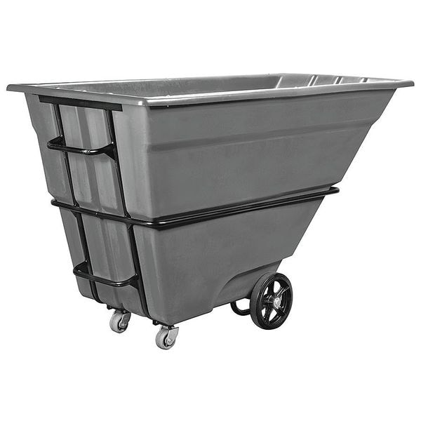 Plastic Tilt Truck, Cubic Foot Capacity 54 cu ft, Load Capacity 2,000 lb, Overall Length 85 in, Overall Width 48 in, Overall LxWxH 85 in x 48 in x 50 in, Overall Height 50 in, Container Material Polyethylene, Color Gray, Handle Type Raised, Mobility Option Manual, Caster/Wheel Configuration (1) Swivel, (2) Axle-Mounted, Caster/Wheel Mounting Location 3-Wheel, Caster Wheel Type Standard, Caster Wheel/Tread Material Rubber, Caster Wheel Dia. 4 in, Caster Brake Type No Brake Included