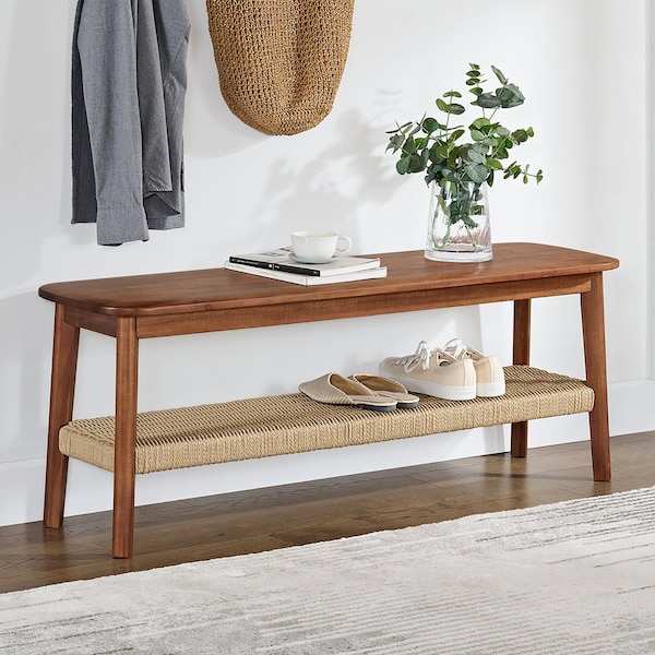 - • The end of bed bench features a warm chestnut finish and woven shelf that are at home with a variety of furnishing styles, like modern farmhouse, coastal, contemporary, and minimalist
