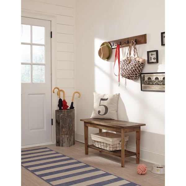 Revive Collection of reclaimed wood furniture features handcrafted design and a reduced impact on the environment. Reclaimed wood wears its history proudly and is long lasting. The lacquer finish allows each piece to show its natural wood knots, cracks, and grain. Beautiful detailing in the wood is a surprising feature. This bench and coat hook set is the perfect addition to any entryway, mud room, or hall. Four double, metal coat hooks are mounted on this natural wood. While the bench is sturdy and also provides shelf storage.