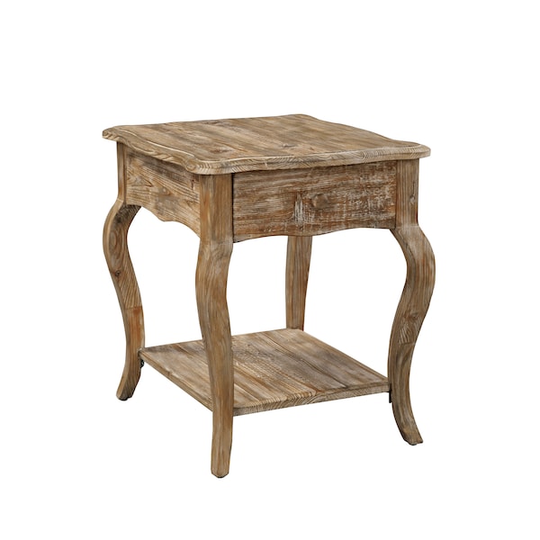 Rustic Collection of reclaimed wood furniture features handcrafted design and a reduced impact on the environment. The light, driftwood finish allows for the natural wood grain to stand out. Queen Anne legs bring a sense of traditional style to this rustic, reclaimed wood collection. End table features scalloped edges with a drawer and a shelf to store or display your favorite items.