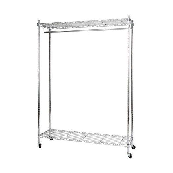 Elegant and functional, this Closet Rack is a metal wardrobe on wheels to meet all your expectations. Its wheels ensure great mobility. Use the two shelves to store bags and accessories. Robust structure includes chromed metal wire on four wheels two locking for mobility. This cloakroom can accommodate up to 26 hangers and 154 lb. of hanging clothes.