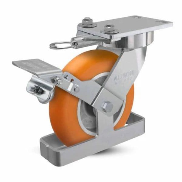 Albion Casters, 8'' x 2'' USA Ergonomic Brake Caster 9.5'' OAH with MAX-Efficiency Orange Wheel, Toe Guard, Swivel Lock, and 6.25'' x 4.5'' Plate, 38AN08228S01LFBKTO Product Features Wheel Diameter: 8 inches Wheel Width: 2 inches Overall Height: 9.5 inches Plate Size: 6.25 inches x 4.5 inches Type: Ergonomic Brake Caster with Swivel Lock Material: MAX-Efficiency Orange Rubber with Toe Guard Model Number: 38AN08228S01LFBKTO Features: Ergonomic design, Toe guard for added safety, Swivel lock for enhanced stability Applications: Ideal for heavy-duty industrial equipment, providing smooth maneuverability and reliable performance Discover the Albion Casters 8'' x 2'' USA Ergonomic Brake Caster, designed to deliver maximum efficiency and durability for industrial and commercial use. This caster features a high-performance 9.5'' overall height, ensuring a reliable and smooth operation even in challenging environments. The MAX-Efficiency Orange Wheel is engineered for optimal grip and reduced rolling resistance, while the Toe Guard enhances safety by preventing accidental contact with the wheel. The caster's ergonomic design includes a Swivel Lock mechanism that provides added stability when stationary, making it perfect for applications requiring precise control and load handling. The robust 6.25'' x 4.5'' plate ensures a secure fit to various equipment, making it versatile across different settings. Whether you need to maneuver heavy machinery or ensure smooth movement in your workspace, this caster offers both performance and reliability.