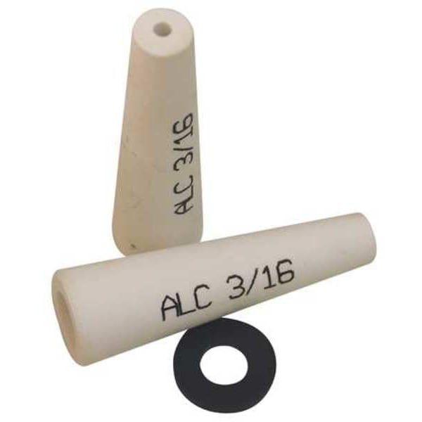 Abrasive Blast Nozzle Kit, Product Type Nozzle Kit, Feed Type Pressure, Material Ceramic, Shape Tapered, Inner Diameter 3/16 in, Tip Outer Diameter 1/2 in, Base Outer Diameter 1 1/8 in, Overall Length 3 3/4 in, Air Flow - Maximum 40 cfm, Includes Nozzle Washer, Compatible with Manufacturer Model Number 40001, 40004, 40005, 41600, Compatible with Grainger Part Number 15E742, 15E743, 15E744, 15E745