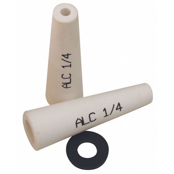 Abrasive Blast Nozzle Kit, Product Type Nozzle Kit, Feed Type Pressure, Material Ceramic, Shape Tapered, Inner Diameter 1/4 in, Tip Outer Diameter 1/2 in, Base Outer Diameter 1 1/8 in, Overall Length 3 3/4 in, Air Flow - Maximum 80 cfm, Includes Nozzle Washer, Compatible with Manufacturer Model Number 40001, 40004, 40005, 41600, Compatible with Grainger Part Number 15E742, 15E743, 15E744, 15E745
