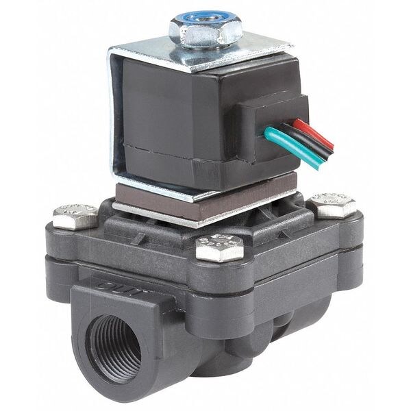 Latching Solenoid Valve, Normally Closed, Pipe Size - Valves 3/8 in, Min. Operating Pressure Differential 10 psi, Voltage 6 to 24V DC, Coil Insulation Class A, Safe Working Water Pressure 150 psi, Operation Pilot Operated, Watts 6 DC, Max. Flow Rate 30 gpm, Coil Enclosure Watertight, Electrical Connections 18 in Leads, NEMA Rating 4, Overall Length 2 3/4 in, Max. Fluid Temp. 180 Degrees F, Overall Width 2 5/16 in, Overall Height 3 1/4 in
