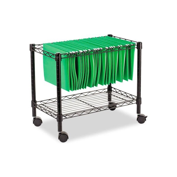 Alera alefw601424bl single-tier rolling file cart, 24w x 14d x 21h, black mobile files help keep paper work handy when you need it and out of the way when you don't. Four 2" hooded casters, two locking. Bottom shelf adjusts in 1" increments and is rated at 250 lbs. Assembles without tools. Accommodates letter size hanging files. Convenient space efficient side by side filing. Color: black; overall width: 24"; overall depth: 14".