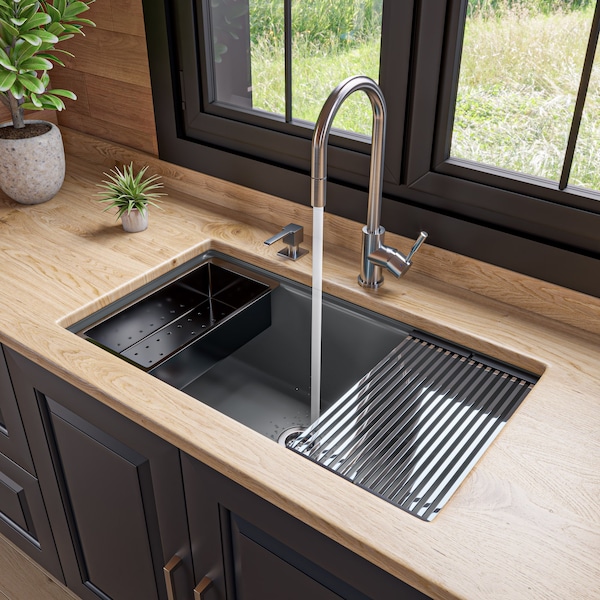 - •This unique titanium color single bowl workstation undermount sink effortlessly blends a sophisticated appearance with lasting durability and minimal upkeep, offering remarkable value.