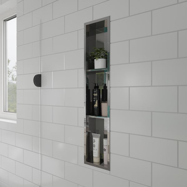 Unlike traditional niches that require extra labor and expensive tile work, this niche is fully finished and ready to mount into your wall opening. Save hundreds of dollars over tiled niches and enjoy the sleek clean look of stainless steel. This 36" niche is as large as they come - offering 3 separate shelves for storage in a space saving narrow vertical design. Not just for your shower or bathtub! This recessed niche is a perfect addition to your bathroom wall, adding convenient space to use for necessary storage or décor. Please note that the shampoo, soap and other accessories shown in some of the images are for demonstration purposes only and are not included. Includes adhesive strips on the back edges and easy-to-follow instructions for fast 3 step installation. Made of solid 304 series stainless steel which is waterproof and rustproof. Perfect for a wet environment. Sloped on all sides by approximately 2 degrees to allow for quick water drainage out of the niche. Installs between studs for a neat, recessed appearance. Interior Size of each Shelf: 11 1/4" x 6 5/8" x 3 7/8". The wall cut out dimensions are 6 3/4" x 34 3/4" Sturdy 20 gauge welded construction which is about 1mm thickness.