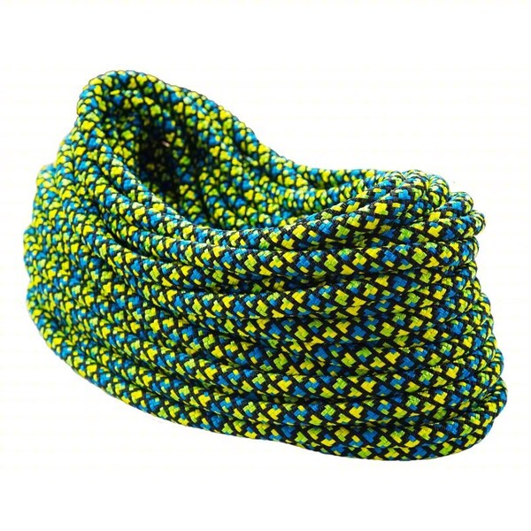 Rigging and Climbing Rope, Rope Type Dynamic, Breaking Strength 10,500 lbf, Working Load Limit 2,100 lb, Rope Construction Double Braid, Diameter 1/2 in, Overall Length 150 ft, Core Material Nylon, Cover Material Polyester, Elongation @ 10 Percent Minimum Breaking Strength Not Applicable, Product Type Rigging and Climbing Rope, Rope Format Bag, Core Type Braided Core, End Type Plain, Spliceability Spliceable, Weight 12 lb, Coating Type Urethane, Color Black/Blue/Green/Yellow