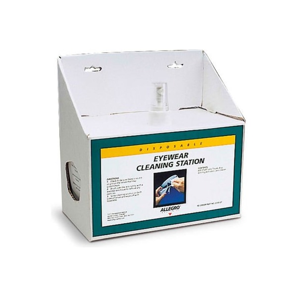 Allegro 0355-01 small disposable cleaning station features 600 easy-dispensing non-abrasive, low-lint 3"x 8" lens tissues and an 8 oz. Anti-static, anti-fog, non-silicone lens cleaner that removes dirt and oil from glasses and lenses. The heavy-duty, recyclable cardboard dispenser may be mounted to the wall or used as a tabletop dispenser. Dimensions: 7"w x 8 1-4"h x 51-8"d