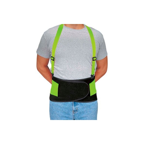 Allegro 7178-02 economy hi-viz back belt, medium designed with an 8" back panel, positive hook and loop material front panels and 3" wide elastic v-shaped side pulls. Hi-viz suspenders. Size medium.