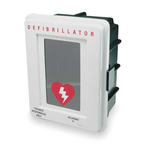 Defibrillator Wall Case, White, Dimensions 18 in H x 14 in W x 9-1/2 in D, Material Plastic, Includes 9V Battery, Alarm, Wall Case with Window
