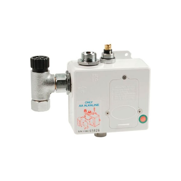 color: white material: plastic length: 4 1/8" width: 3 1/2" voltage: 120 v dc national pipe thread: 1/2" npsm type: automatic depth: 2" note: uses (4)fmp#253-1241 or ac adaptor (not included)
