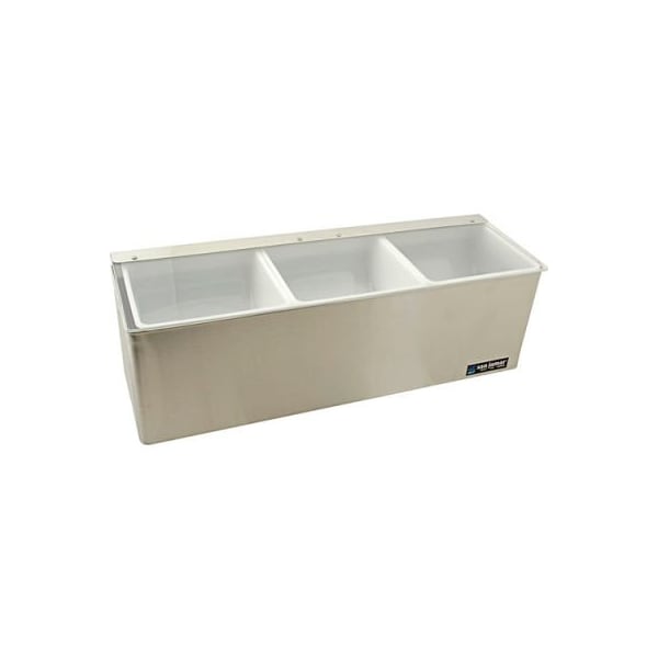 material: stainless steel body w/ lid | plexiglass lid width: 18 1/8" | 460 mm height: 5 1/2" | 140 mm includes: 3-1qt (946ml) compartments depth: 5 3/4" | 146 mm