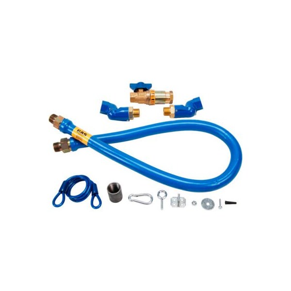 length: 48" coating: plastic gas hose includes: (2) swivel max, (1) coupling, hardware | equipment restraining device | heavy duty gas hose, safety quik disconnect national pipe thread: 3/4" fittings