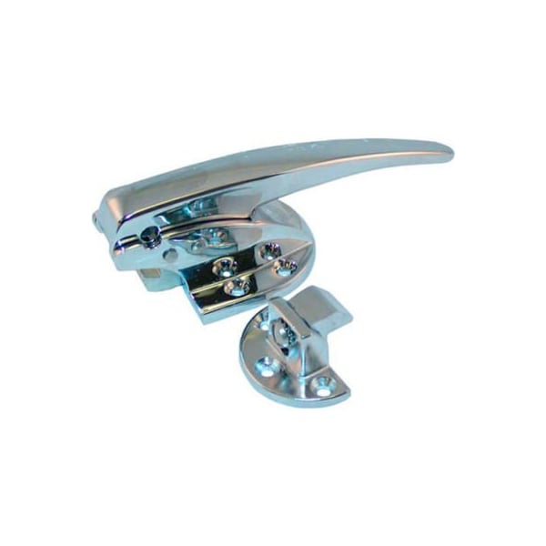 mechanical latch w/ strike, polished chrome offset handle, no lock offset flush to 3/8" length 5-57/64" width 2-3/32" outside screw centers 7/8" x 1-1/2" 3 hole strike 2-1/16"w x 1-3/32"l x 1-3/32"h. for series: 930