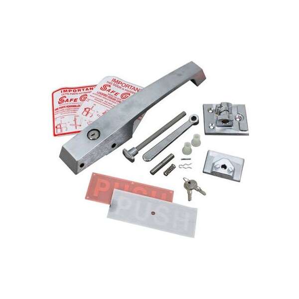 heavy duty lever locking handle. brushed chrome, lever turn release, lock and keys. 14-1/32" od x 2-7/8" wide x 2-1/4" high. mount holes 2" ctrs. high pressure die cast zinc. walk-in flush mount handle with inside release and built-in lock. Can be used with padlock. nsf