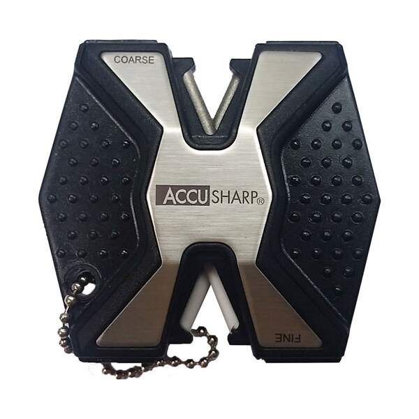 Accusharp Diamond?Pro 2-Step Knife Sharpener ;The Accusharp Diamond?Pro 2-Step Knife Sharpener Features;Pre-Angled Coarse Diamond And Fine Ceramic Rods To Sharpen,;Restore, And Then Polish A Blade?S Edge. One Of Our Newest;"Award Winning" Designs, The Diamond Rods Are Aggressive;Enough To Sharpen All Types Of Steel. The Flip Side;Consists Of Two Ceramic Rods Used To Finish And Polish The;Edge For A Smooth, Sharp Finish. The Diamond?Pro 2-Step;Exterior Is Made Of Brushed Aluminum And Finished With A;Rubber Molded Grip And Rubber Feet For Safety. The Unit Has;A Lanyard Hole Which Allows For Easy Attachment To Cord Or;String.