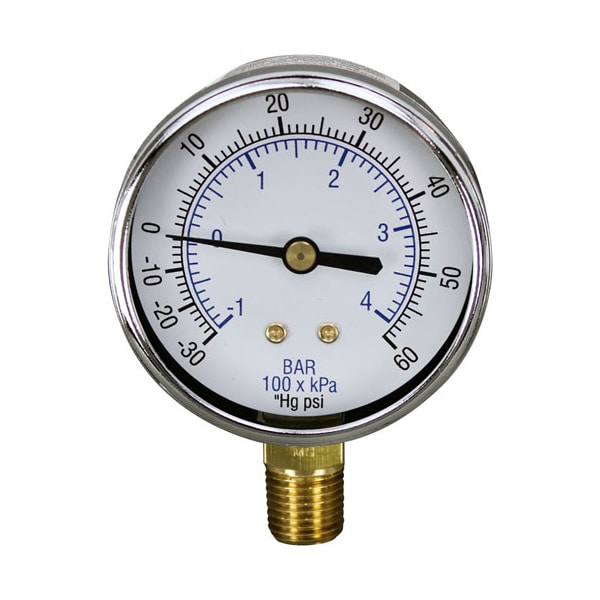 Pressure Gauge 0-60 Psi;2-1/2" Dia Dial;Bottom Mount 1/4" Mpt;Groen
