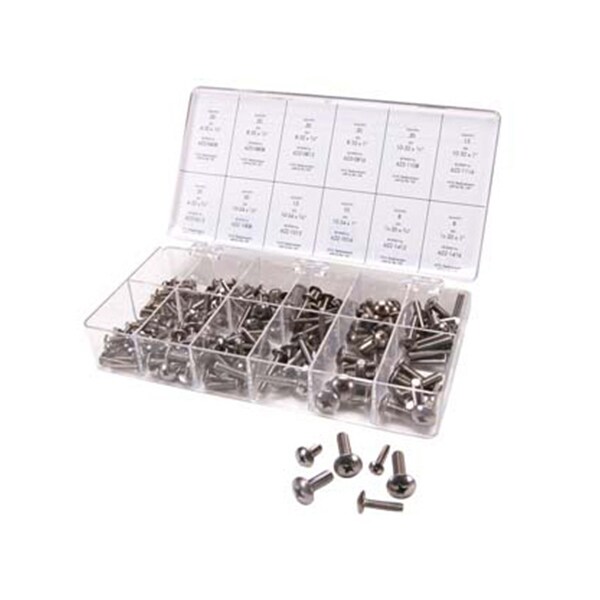 Medium Length Stainless Steel Machine Screw Kit ;- Truss Head Slotted Screws ;- Contains 196 Pieces Ranging From Sizes ? 6-32 X 1/2?;To1/4-20 X 1?