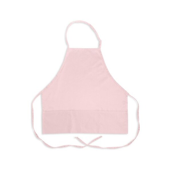 Bib apron,27 in (L) x 26 in (W),36 in ties on each side,100% spun polyester construction,Adjustable metal neck clasp,3 pockets,Bar-tacked on all stress points,Pink color