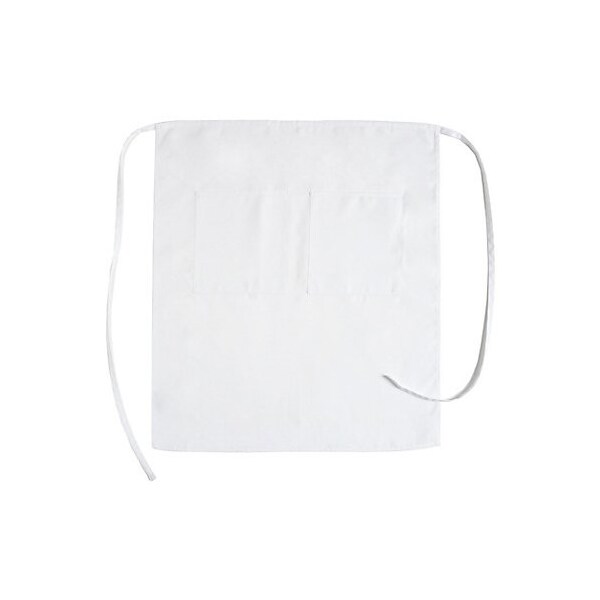 Bistro apron,32 in (L) x 28 in (W),37 in ties on each side,100% spun polyester construction,Two pockets,Bar-tacked on all stress points,White color