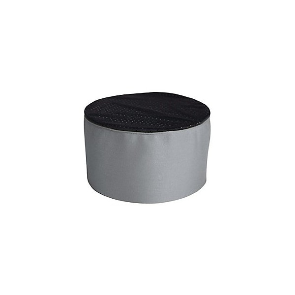 Chef skull cap,4 in (H),21 1/2 in to 22 1/2 in hat band,One size fits all,100% spun polyester construction,Mesh top to keep wearer cool,Hook and loop closure,Slate with black top