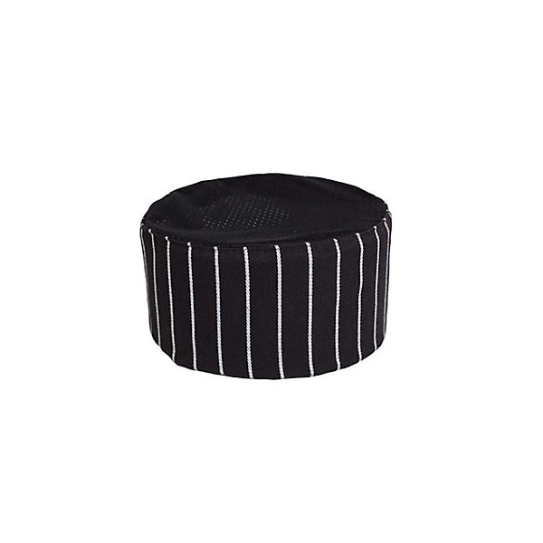 Chef skull cap,4 in (H),21 1/2 in to 22 1/2 in hat band,One size fits all,100% spun polyester construction,Mesh top to keep wearer cool,Hook and loop closure,Striped with black top