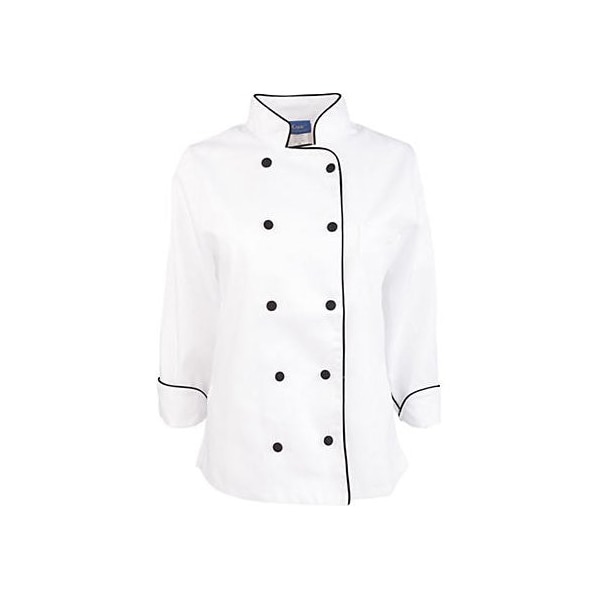 Women's executive chef coat,Large,100% spun polyester construction,Divided thermometer pocket on left sleeve,Fabric covered buttons,Side seam vents,Long sleeve,White with black piping