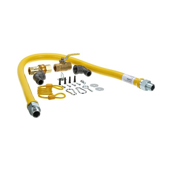 Gas hose 48 in (L) 3/4 in Connection Stainless; steel corrugated tube and braiding PVC; coating Includes, quick disconnect, gas ball valve, 90 DEG.; elbows and restraining cable with hardware Rotational end; fitting Yellow color Temperature resistant up to; 350 DEG.F CSA certified