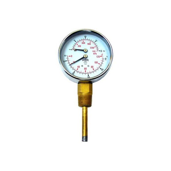 temp/pressure gauge, 0-200 psi, 30-240f, 3" dial, 2" stem, 1/2" mpt hubbel booster