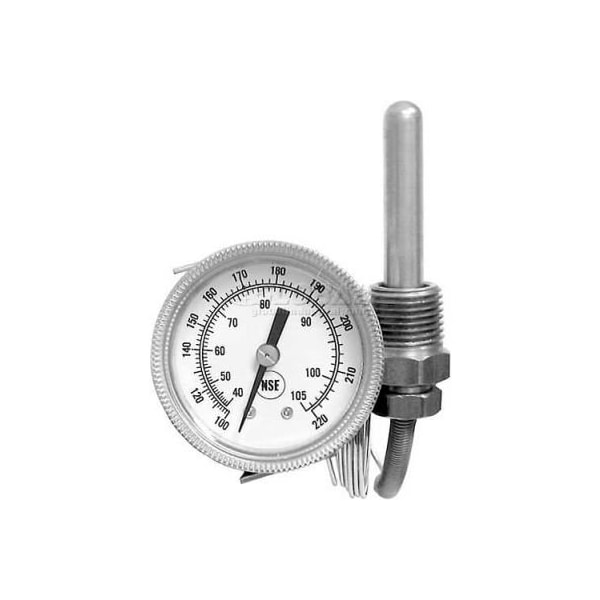 Temperature gauge, 2" dia., -100-220f, rear mount palnut, for american dish service, 299-1005 6' cap, 1/2" mpt bulb connection, 1/4" x 2" bulb, dial size 2, connection 1/2" union, nsf approved.